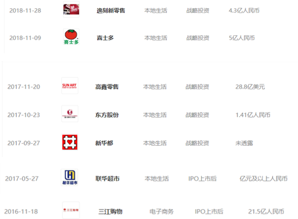 阿里对商超的布局,也是大手笔;特别是28.8亿美金战略投资高鑫零售,大润发从此站队阿里系,开始对商超新零售的探索。盒马是新物种创新,大润发是大卖场存量改造。