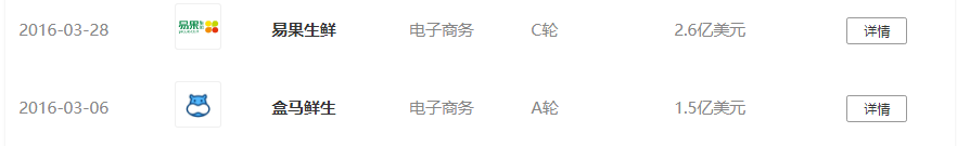 易果生鲜是生鲜电商模式,盒马是生鲜O2O模式,两者在商业模式设计上不一样。有意思的是,盒马A轮1.5亿美金与易果生鲜C轮2.6亿美金是在同一时期融资的。