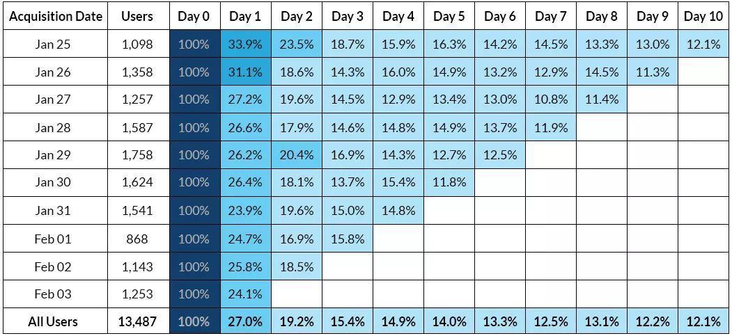 用户生命周期的刻画指标根据业务的不同会有不同分类,比如借贷平台会关注平台中的用户会借几笔,电商平台会关注平台中的用户会买几单等。在这里推荐cohort群体分析法,定位观察维度,然后确定留存观察粒度。比如:下面以每日新增用户为观察维度,然后给定不同周期(日)后的留存率,找到收敛值及收敛时间节点。