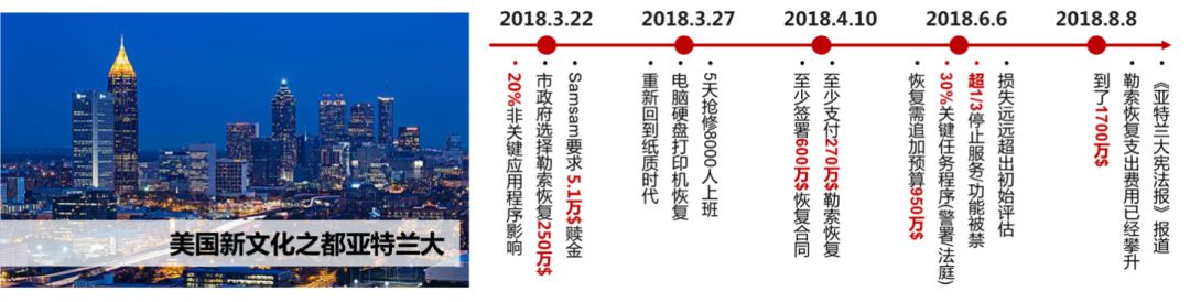 亚特兰大市政府遭遇持续性重大勒索病毒攻击,被要求支付赎金5.1万美金,但亚特兰大市政府拒绝支付,宁可支付250万美金用于勒索恢复。根据评估:20%的应用程序遭受影响,没有关键应用被破坏。