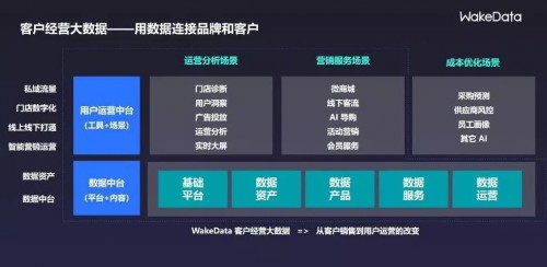 首先是门店的数字化程度不够。线下流量数据的沉淀,可以通过移动设备扫码、前端设备记录等方法实现。在线下数据资产的基础上,通过WakeData数据中台,可以实现数据驱动的产品迭代、智能营销和运营服务。对于很多品牌企业而言,用户数据大多没有沉淀在企业的自有系统中。比如餐饮企业的数据掌握在O2O服务商手里、传统线下企业的数据掌握在经销商手里,类似这样的情况不在少数。但是如果无法通过数据充分了解自己的用户,企业又如何为用户提供满意度更高的产品呢?因此,WakeData数据中台希望通过数据连接品牌与用户,实现数据驱动产品迭代与运营服务,帮助企业完成客户销售到用户运营的转变升级。