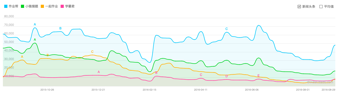 作业帮、小猿搜题、一起作业、学霸君百度指数(2015.09-2016.09)