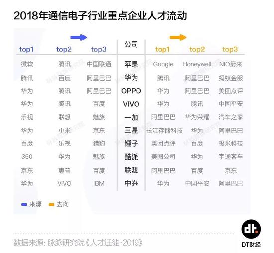 2018年通信电子与互联网行业间的人才流动较往年更为密切。尤其是华为,人才来源与去向Top3均被BAT承包,俨然成为“半个互联网”公司。
