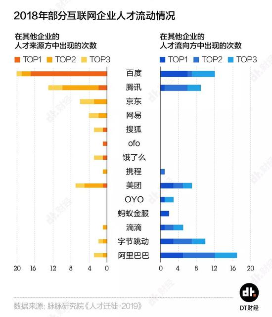 脉脉研究院的报告也证实了百度的窘境——2018年,百度是中国17家大型互联网公司的Top 1人才来源。