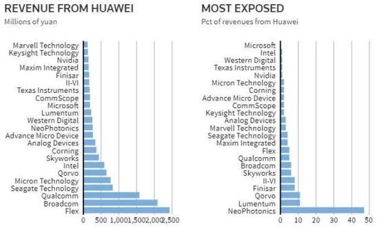 从收入净值的角度来看,伟创力在所有美国科技企业当中对华为的依赖度最高(下表)。