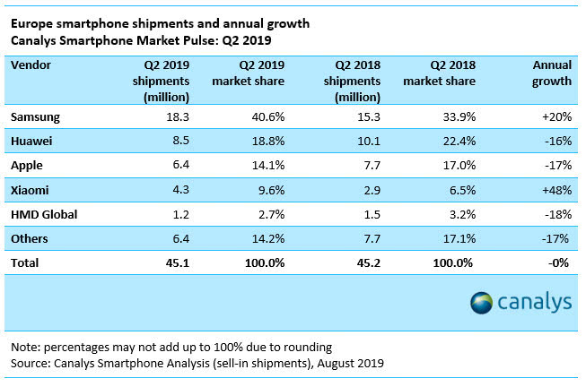 Canalys表示,2019年欧洲智能手机第二季度总出货量为4510万部,与2018年第二季度的4520万部相比基本持平。其中,iPhone欧洲出货量从2018年第二季度的770万部下降到今年同季的640万部。销量下降了17%,导致苹果在欧洲智能手机市场的份额在12个月内从17%下降到14.1%。