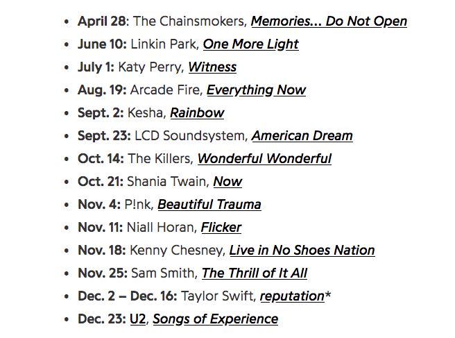 据统计,在 2017 年 52 周的 Billboard 专辑周榜冠军中,有 14 张唱片都有通过演唱会捆绑的方式来促进数据。
