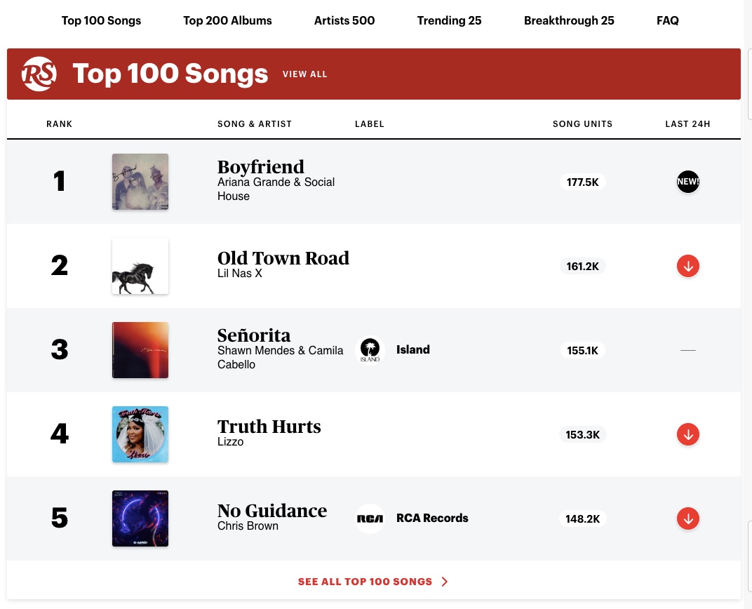 作为直接回应,,让流媒体数据获得更高权重,计算数据更透明。这本 50 多岁的杂志去年被收购后,开始了跨越全媒体平台的转型,这个榜单也是其中一部分。