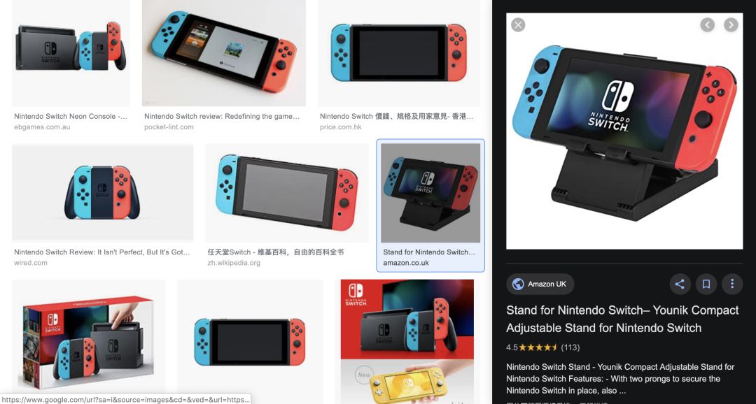 在最新的升级之后,用户在选择图片时更加方便。点击搜索结果中的图片,它会显示在页面右边,向下滚动时也常驻。详情页面显示了图片来源、产品名称、品牌、价格、库存状态等信息,你可以在下面看到相似图片,点击箭头切换下一张。