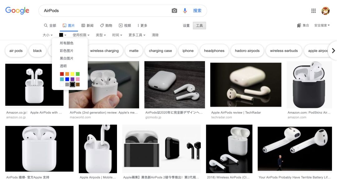 第二个筛选条件是按颜色,这个功能经常用来搜索 PPT 配图。这里还可以选择「透明图片」,也就是没有背景的 PNG 图片,省去抠图的过程。