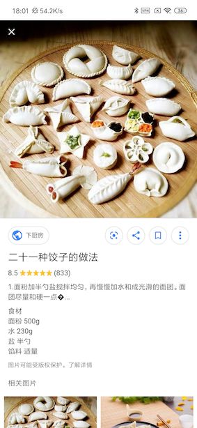 除了桌面网页,Google 图片的移动端也非常好用,它还有很多独有的新功能。在搜索一些物品时,搜索结果的图片上会显示图片的内容类型,比如搜索食品时显示「菜谱」,点开后可以看到简单的制作过程摘要;搜索数码产品时显示「产品」,点开后显示售价、品牌等信息。