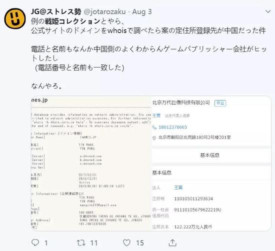 《战姬收藏》是中国游戏这点也早已不算什么秘密。在这段时间,有几位日本玩家根据蛛丝马迹找出了这家公司来自中国的证据。一位推特用户表示,他发现《战姬收藏》官方推特绑定的是一个“QQ邮箱”,并解释这个邮箱在中国十分普及,但也很负责任的说这是“推测”。
