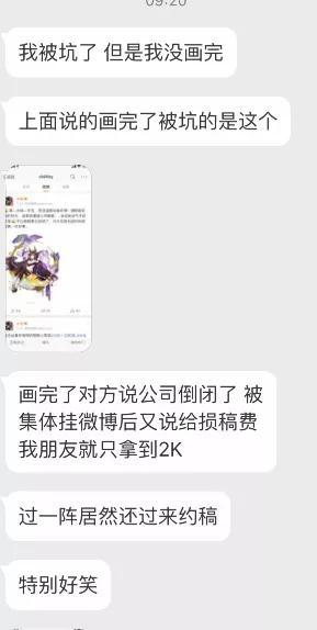一位同样也被坑害的画师告诉我,近期这家公司以“公司解散”为由,拒付了很多画师全款稿费——尽管这些画师已经把稿子画完了。但好在“被挂”之后,他们又补偿给了画师“损稿费”。