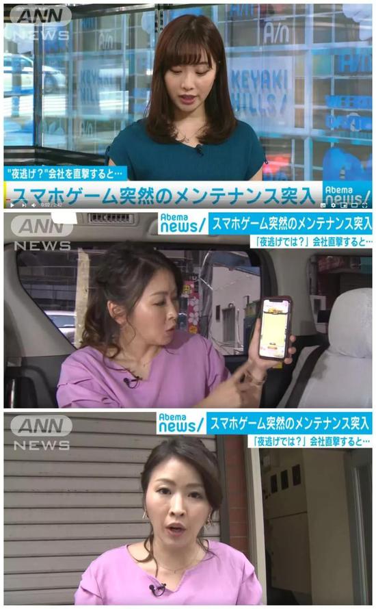 在官方消失的十几天后,这件事还登上了日本新闻,标题是写着“半夜跑路的游戏”。明晃晃的美少女立绘出现在电视屏幕里,女主持拿着手机点开游戏,向摄像机展示着一片空白的游戏公告栏,随后来到空无一人的办公楼。