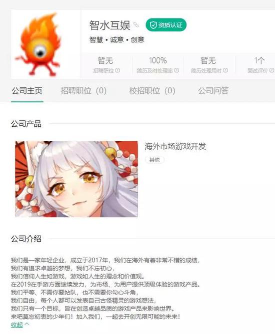 也有人根据法人信息推测出,《战姬收藏》和一家名为“智水互娱”的中国公司有联系,这家公司招聘网站的产品里,也正好放着一张《战姬收藏》的截图: