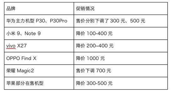 在对天猫、苏宁和京东等电商平台进行统计后发现,近期有超过30款4G手机启动降价。其中,华为主力机型P30、P30Pro,售价分别下调了300元、500元;小米9、Note 9、vivo X27等热门机型,降价100-400元;OPPO Find X大幅降价1000元;荣耀Magic2下调700元,创下售价新低;苹果部分在售机型同样也有300-500元的降幅。