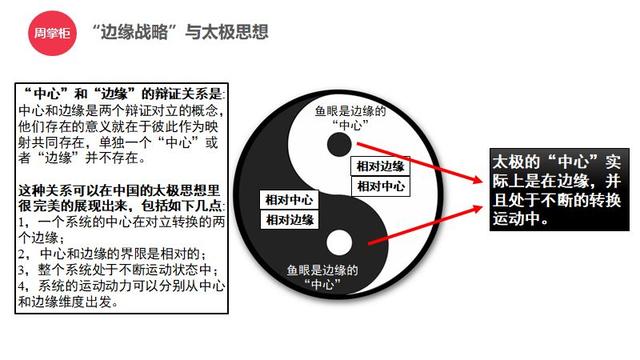 其实在太极图中,这种关系可以很完美的展现出来:其一,一个系统的中心(鱼眼)在对立转换的两个边缘;其二,中心和边缘的界限是相对的;其三,整个系统处于不断运动状态中;其四,系统的运动动力可以分别从中心和边缘维度出发。