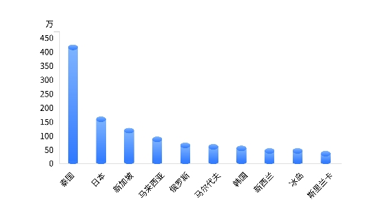 目前国家受欢迎的排名情况,在一定程度上反映了国内游客出行考虑到的相关因素:价格、距离、口碑等性价比较高的泰国成为最受国内消费者关注的国家;日本、新加坡、马来西亚、俄罗斯、韩国等周边国家也成为国内消费者青睐的旅游目的地。