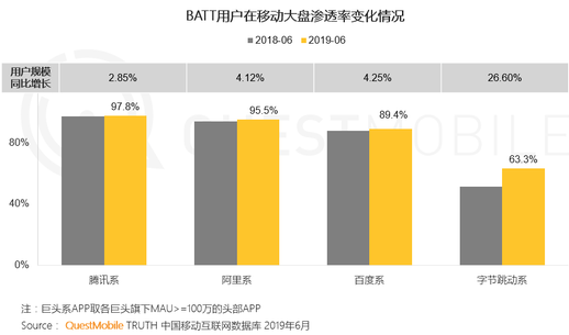 这种背景下,百度的表现却让人有些吃惊。据QuestMobile统计,2019年6月百度系APP在移动大盘的用户渗透率为89.4%。