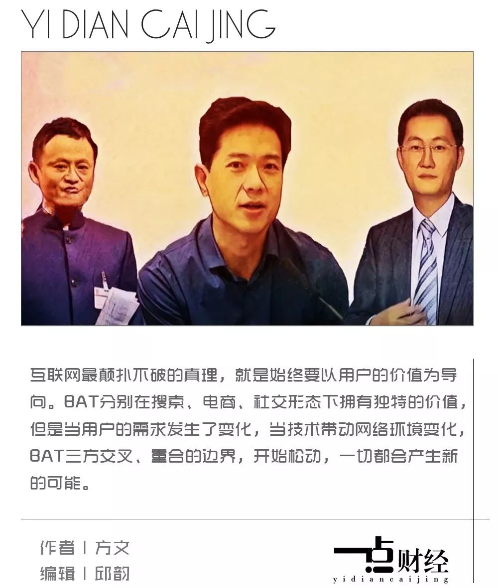 互联网最颠扑不破的真理,就是始终要以用户的价值为导向。BAT分别在搜索、电商、社交形态下拥有独特的价值,但是当用户的需求发生变化,当技术带动网络环境变化,BAT三方交叉、重合的边界,开始松动,一切都会产生新的可能。