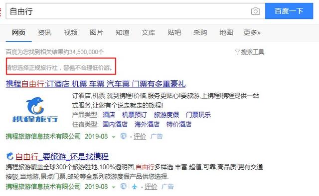 8月13日,百度发布旅游保障升级计划,推出四大举措。用户全网搜索旅游相关关键词时,会在搜索结果中的广告内容出现蓝色的盾牌型“保”字标识。用百度APP搜索“旅游”、“自由行”等旅游相关核心高频关键词,在搜索结果顶部,有相应的风险提示。百度引入了第三方机构中华人民调解委员会,当用户在旅游等各个领域遭遇纠纷时,可以帮助用户通过线上线下联合的方式进行维权。此外,百度还通过AI技术,对旅游广告和自然搜索结果进行清查。