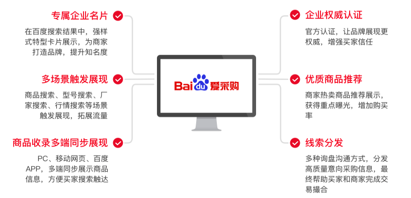 其次,百度爱采购六大权益对商家的作用可以体现在以下几个方面: