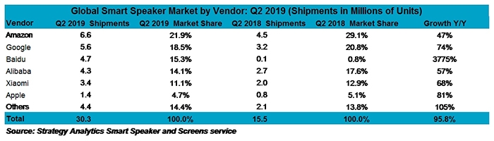 2019年全球Q2智能音箱销量排名 百度中国第一