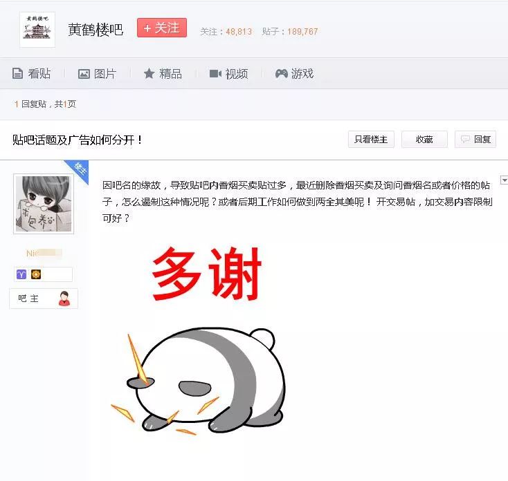 " 黄鹤楼 " 吧几乎被烟民们 " 占领 "。为了应对这一情况," 黄鹤楼 " 吧甚至开启了 " 全吧禁言 " 模式,仅允许吧务人员发言。该吧吧主甚至在贴吧首页发帖求助称,由于吧名与某品牌香烟同名,贴吧内买卖香烟的帖子过多,目前正在向吧友征求意见,询问如何开展后续工作。