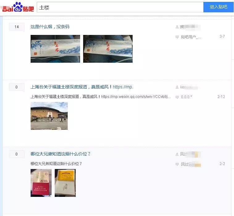 在 " 土楼 " 吧中,现代快报记者看到不少烟民都在吧内求购香烟。在一个名为 " 看看这是什么烟,没有条码。" 的帖子中,几位烟民对帖中展示的香烟起了兴趣,留言问:" 多少钱一包?"、" 外地的该怎么买?" 一个烟草贩子随即回帖称," 我家有,加微信交易。"