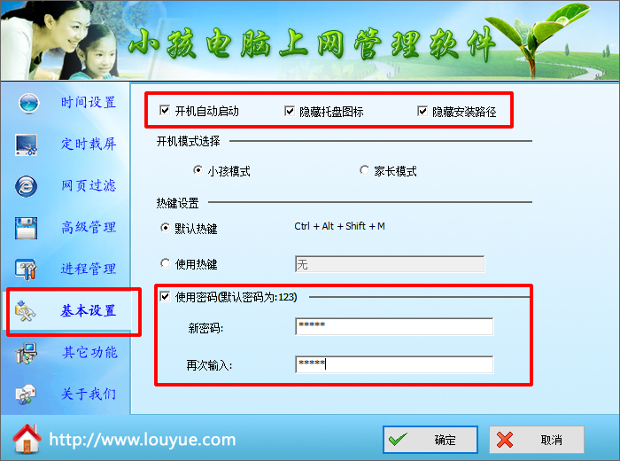 3,接下来还需要对软件的隐蔽性进行设置,进入“基本设置”选项卡后,勾选上“开机自动启动”,“隐藏托盘图标”,“隐藏安装路径”,然后再在下方设置一个密码。默认密码为123,如果不设置新的密码的话,小孩也可以进入软件,并修改其参数,这样就起不到限制电脑访问指定网站的功能了。