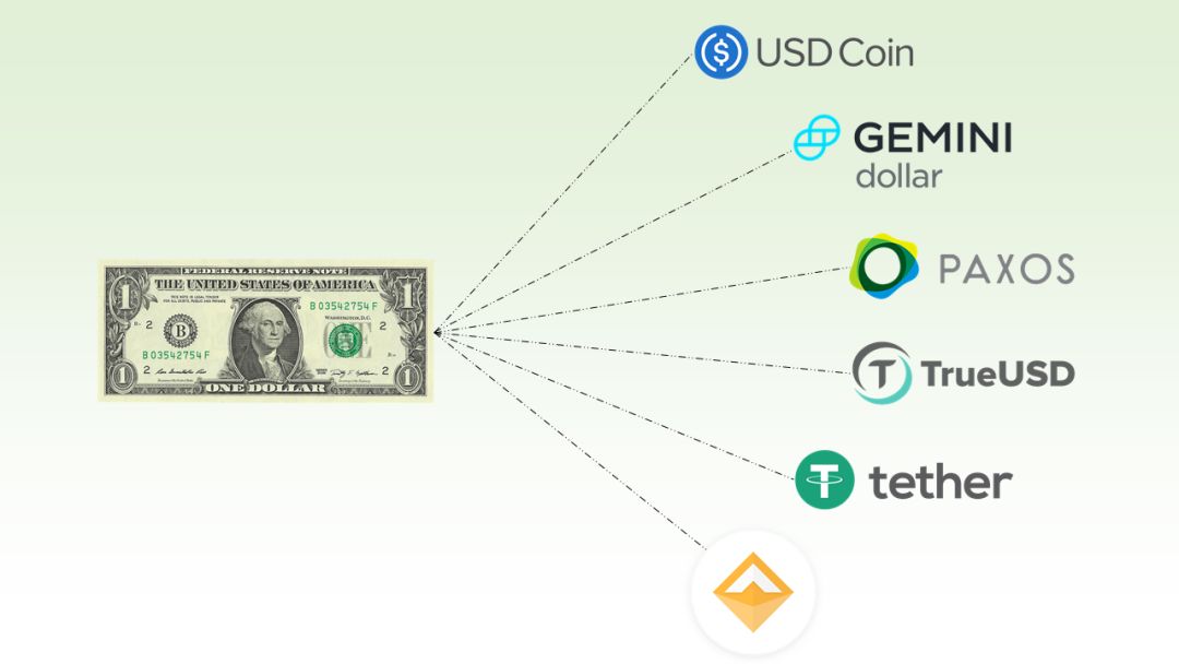 稳定币是一种和现实世界法币 1:1 锚定的数字货币,目前有两种方法可以实现稳定币的发行,一种是在合规的托管银行抵押美元,或其他的法律货币发行稳定币,而另一种是超额抵押数字货币发行稳定币。稳定币成为了连接数字世界和现实世界的接口,一切有关法币的应用,都可以通过稳定币的智能合约得以实现。