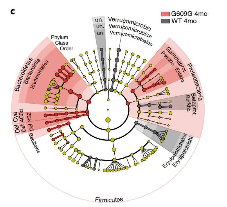 图 | 早衰症小鼠与野生型对照小鼠的肠道菌群丰度差异,红色表示在早衰小鼠体内丰度增加,灰色表示 WT 小鼠体内的丰度增加(来源:Nature Medicine)