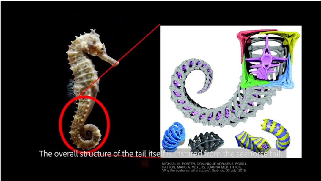 研究小组在他们的论文中提出,尾巴原型的尾部单元由不同数量的关节单元组成。每个关节由四个保护板和一个可调节重量的椎骨组成。在每一个关节,使用弹性绳将板块连接在一起,脊椎通过弹簧装置与这些板块相连。这能模拟海马骨架对横断面变形和压缩的抵抗力,同时也能产生支持尾巴运动的切向力和剪切力。
