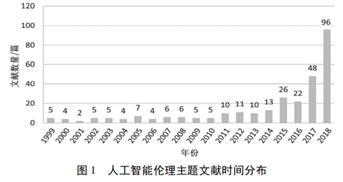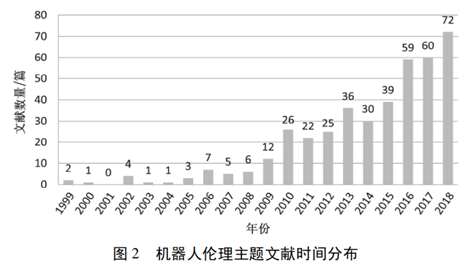 从1999-2018 年的 Web of Science数据库(以下简称WOS数据库)中,无论是以“人工智能伦理”为主题的文献还是以“机器人伦理”为主题的文献都呈现出显著的增长趋势。特别是近十年来,相关文献出现了井喷式增长1999 至 2015 年文献量的总和。这样高速的增长趋势,表示出越来越多的学者意识到人工智能伦理研究对于社会发展的重要意义与积极作用,探索人工智能伦理研究的知识情报有助于人工智能产业以及人类社会的健康发展。