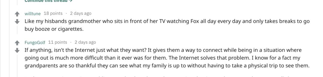 Reddit 网友@willtune 则想到了他的祖母,每天整天都在电视机前看着 Fox News 频道,仅在中间的休息时间去买酒或者香烟,剩下的时光都泡在了电视上。