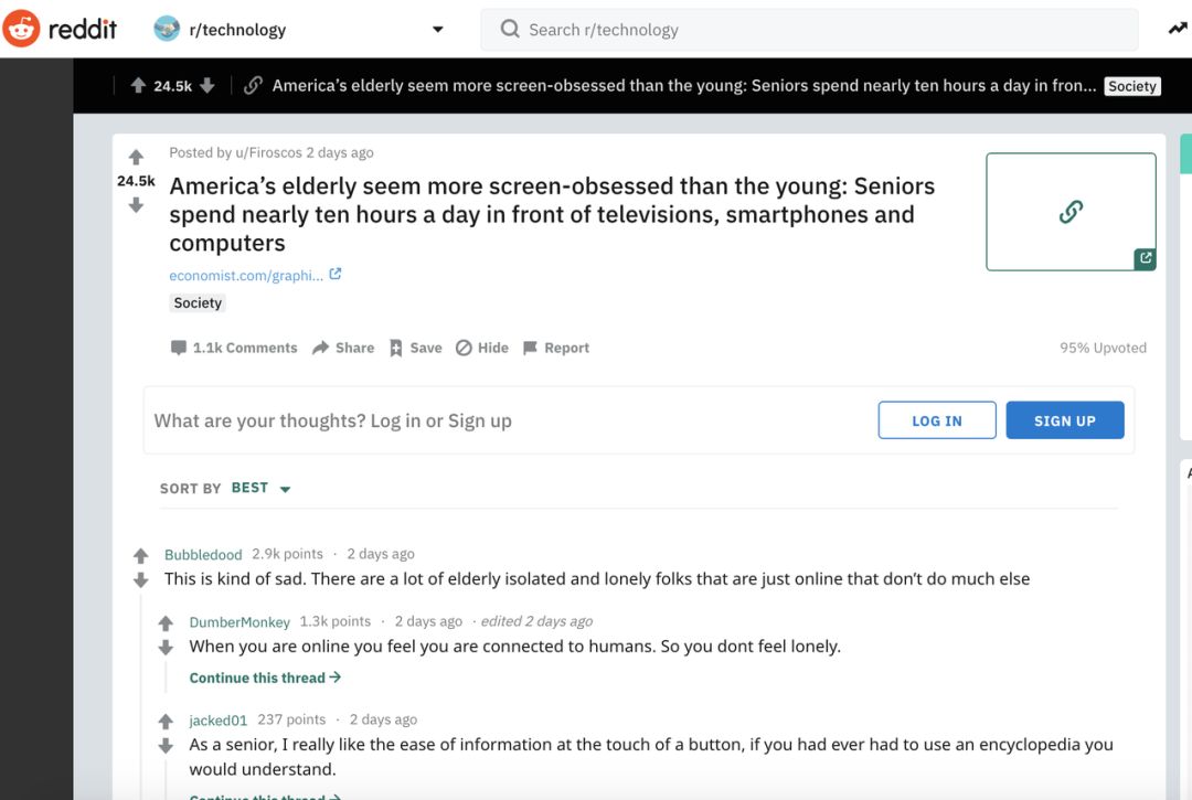 Reddit 网友 @Bubbledood 表示,其实这个消息有点难过,有很多孤独的(美国)老年人只是在线,没有做太多其他事情。