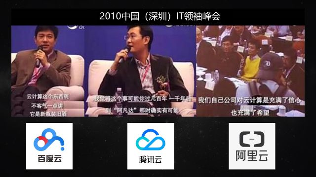 关于这个问题我的思考是这样的,我们现在把时间拨回到 2010 年,当时在深圳有一个中国 IT 领袖峰会,BAT 的三位大佬都在上面分享了他们对于云计算的看法,有人觉得云计算就是新瓶装旧酒,有人觉得这个东西可能要过个几百年上千年甚至到阿凡达那个时代才能实现,也有人已经撸起袖子开始干了。但是到今天为止我们发现,他们都不约而同地推出了他们的云服务。