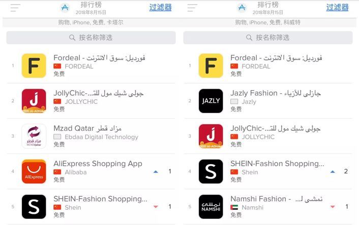 令人意想不到的是在六个国家前五名中,已经被我国的跨境电商平台Fordeal、ClubFactory、JollyChic和SHEIN占据,AliExpress则只在卡塔尔和巴林跻身前五。