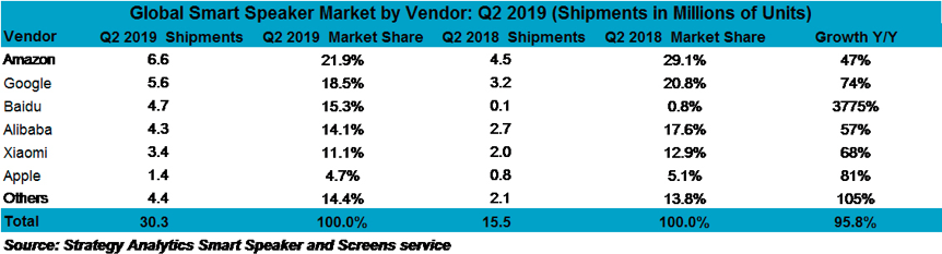 在AI领域,百度保持了快速的增长并逐步扩大商业化成果。小度系列智能硬件在2019年上半年的整体出货量居全国榜首。据全球领先的科技市场分析公司Canalys和Strategy Analytics的研究显示,小度智能音箱在2019年第一季度在中国和全球智能音箱出货量中分别排名第一和第三。而前不久Strategy Analytics 发布的2019年第二季度全球智能音箱出货量报告显示,小度智能音箱以470万台的出货量蝉联国内第一、全球第三的成绩,相较去年第二季度同比增长3775%。