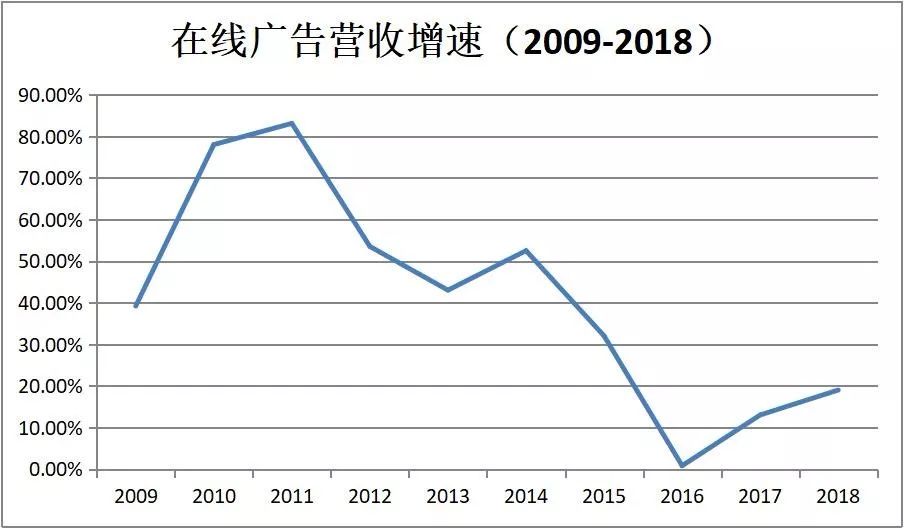 当然,另一个不可避免的因素是百度自身的盈利模型。对2009-2018年百度在线广告的营收增速进行统计后可以发现,以2016年为界,其增速呈现出了明显的分化,2016年以来增速虽有所上升,但整体增速较低。