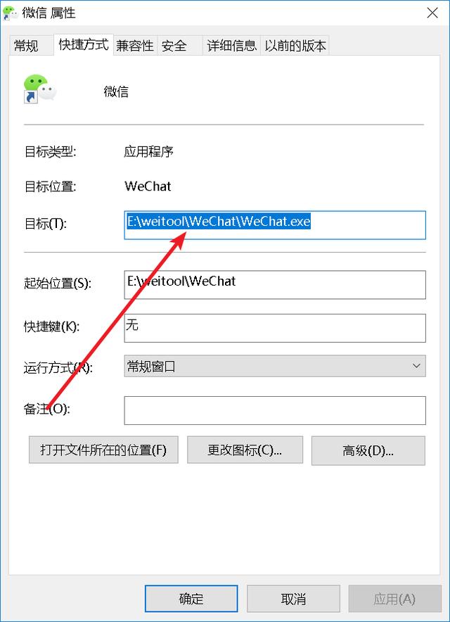 然后将 E:\weitool\WeChat\WeChat.exe中的weitool上加英文双引号