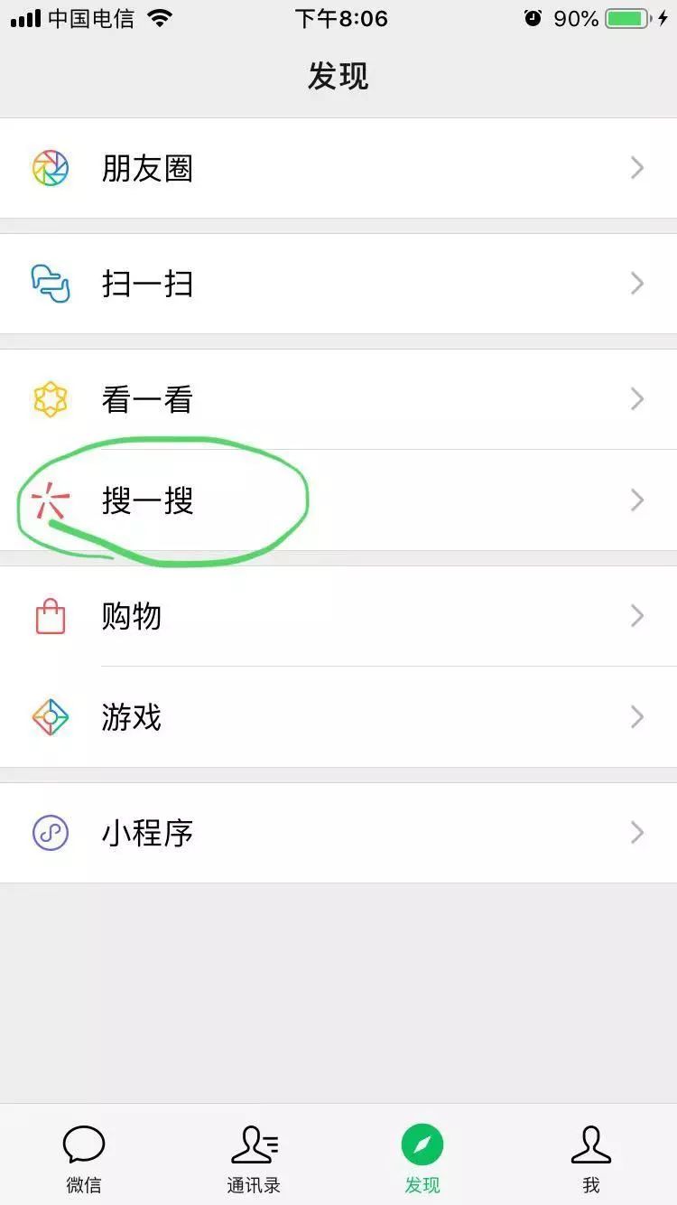 第二个入口在「发现」的tab内,有一个「搜一搜」,点击进入,则会出现下方第三张图的界面。