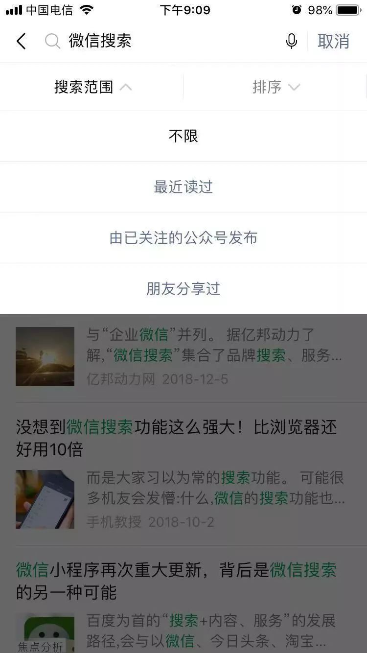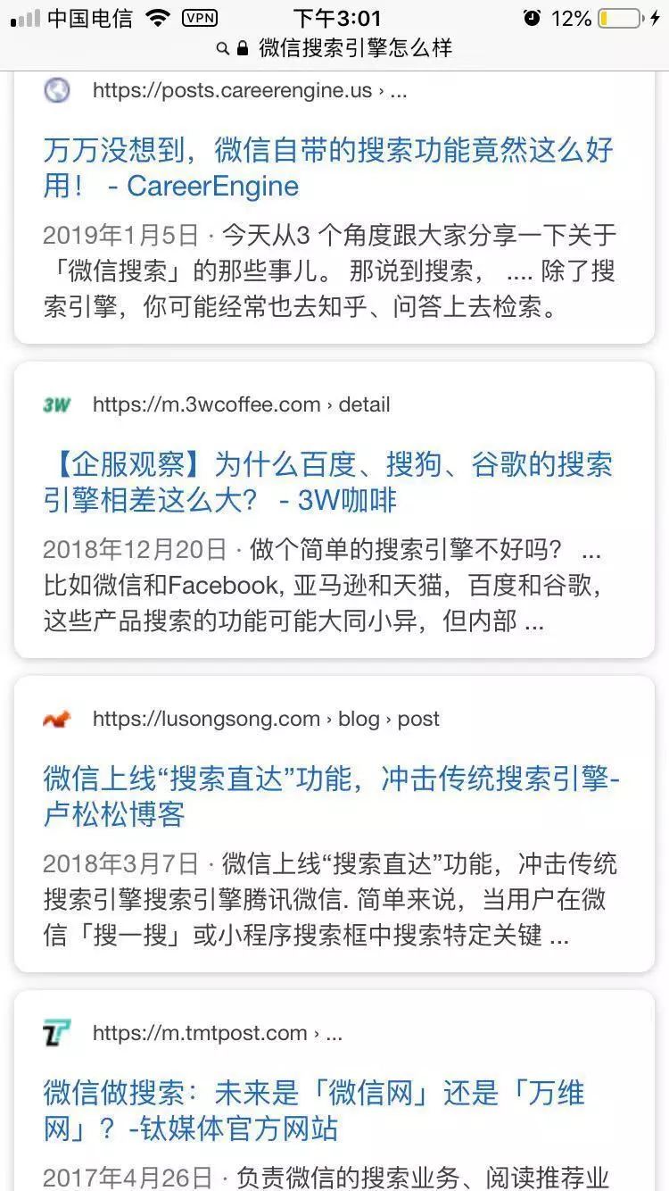 搜出的内容,前几条是公众号的文章,后面有一些微信小程序、视频相关的内容,无广告,搜索结果都来自于微信以及其他腾讯的内容,这些内容的质量较高,排列在前面的都是阅读量较高的文章,或者朋友看过的文章。