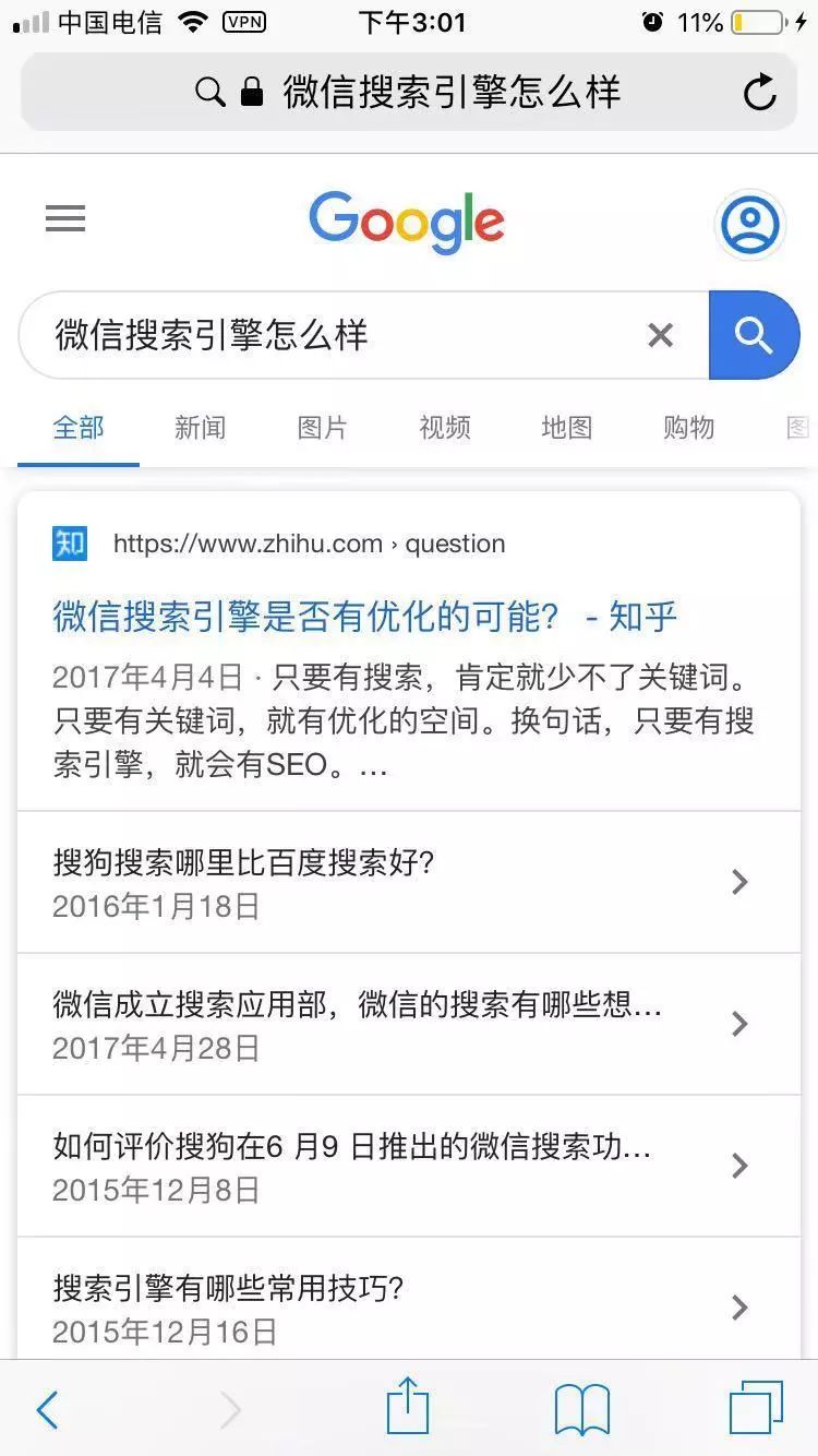 谷歌搜索「微信搜索引擎好用吗?/怎么样」搜索结果
