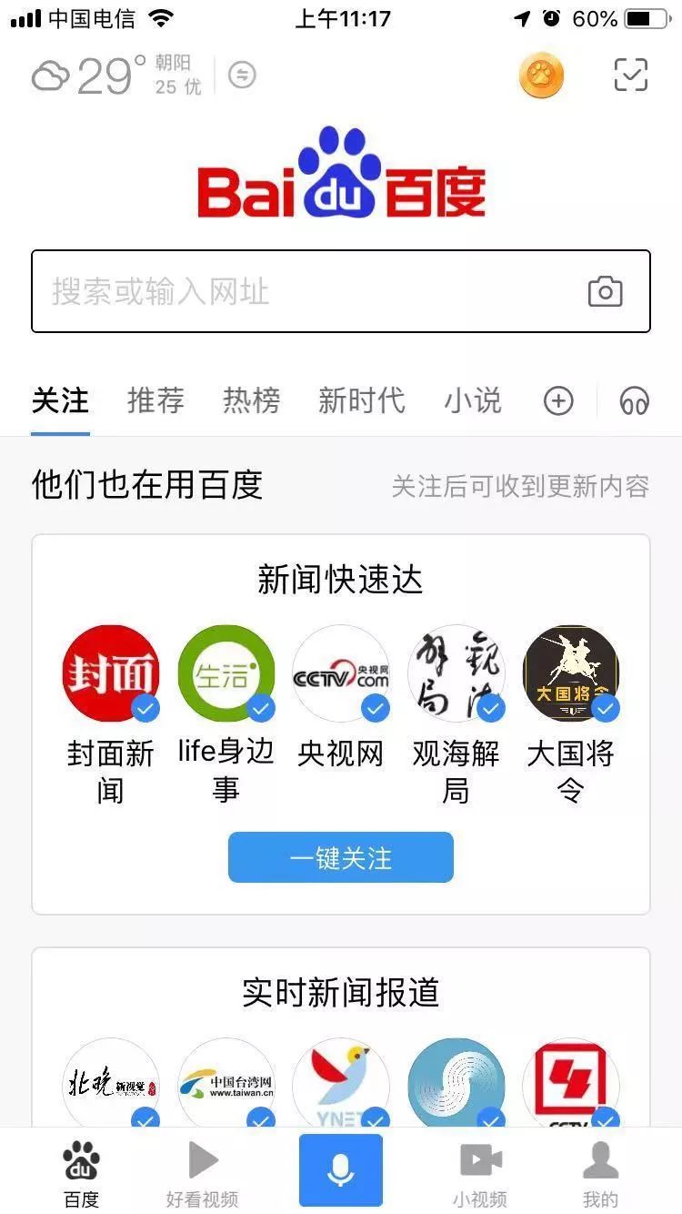 百度搜索的首页分为两部分,搜索框+信息流推荐内容。