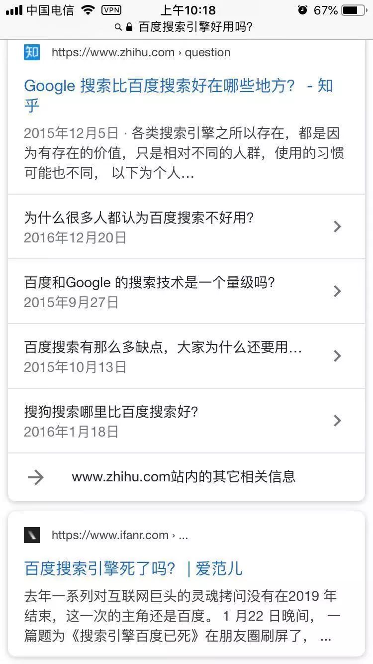 Google搜索「百度搜索引擎好用吗」,我们得到以上结果:知乎上关于讨论为啥百度不好的问答,谷歌搜索与百度搜索的对比,还有一些比较直接的谩骂。