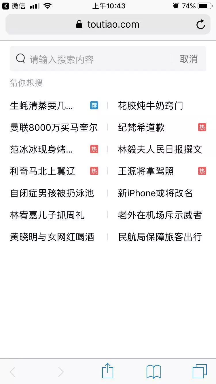 让我们打开头条搜索,通过网址https://m.toutiao.com/search即可进入头条搜索主页。(P.S.用移动端打开哟,PC端打开效果一言难尽别问我怎么知道的。)