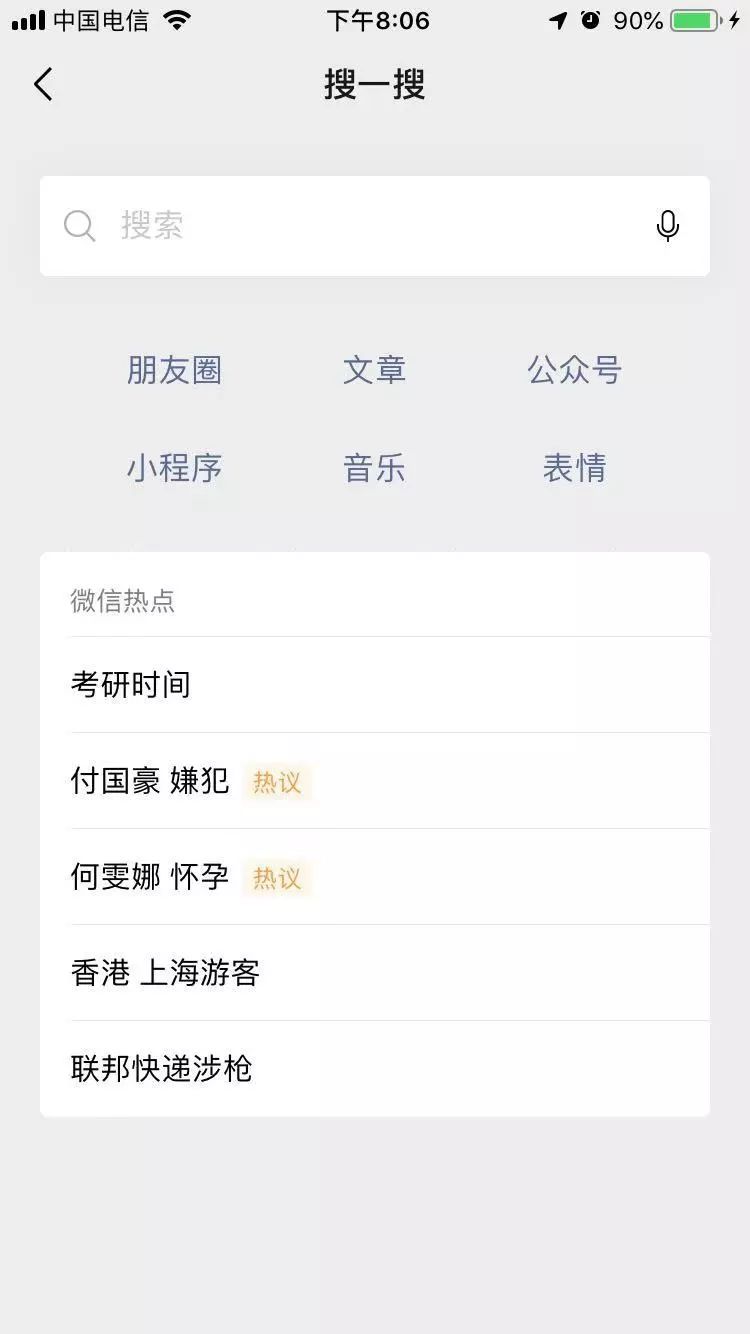 与百度搜索、头条搜索非常不一样的是,微信搜索提供六个类型的结果:朋友圈、文章、公众号、小程序、音乐、表情,下方则是微信热点。