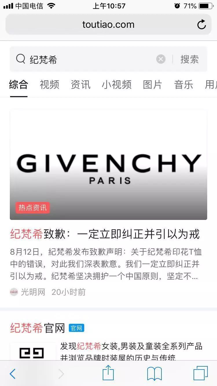 小线菌重复试验头条搜索的步骤,在搜索框搜索「纪梵希」,得到的首页的第一条是广告,而后是官网,关键词也被标红。