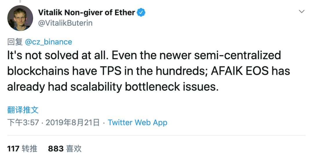 V神回复道:(速度和可拓展性问题)并没有解决。即使是最新的半中心化区块链也只有几百的TPS;据我说知,EOS已经遇到了可拓展性瓶颈问题。
